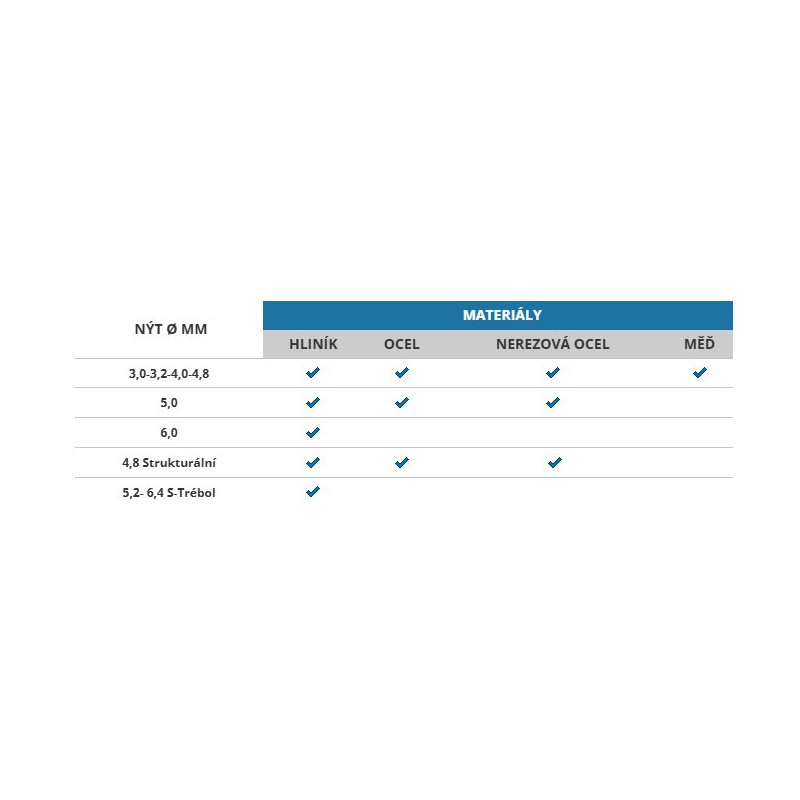 Aplikační plocha: až 6.0 mm, 4.8 pro strukturální nýty a 6.4 pro S-Trébol.