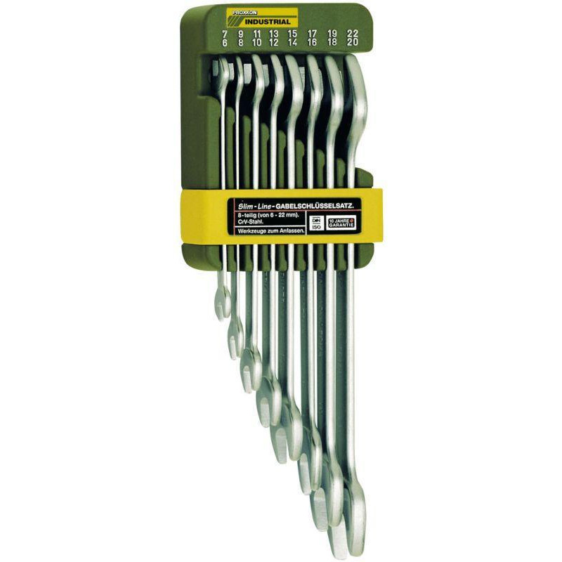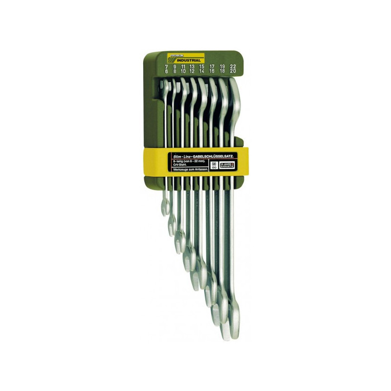 Sada očkových kľúčov Slim-Line s vyhnutím hláv 75°. 8-dielna sada v držiaku. Dokonalá povrchová úprava pozostáva z dvojnásobného poniklovania a pochrómovania. Obsahuje kľúče 6 x 7, 8 x 9, 10 x 11, 12 x 13, 14 x 15, 16 x 17, 18 x 19, 20 x 22 mm.