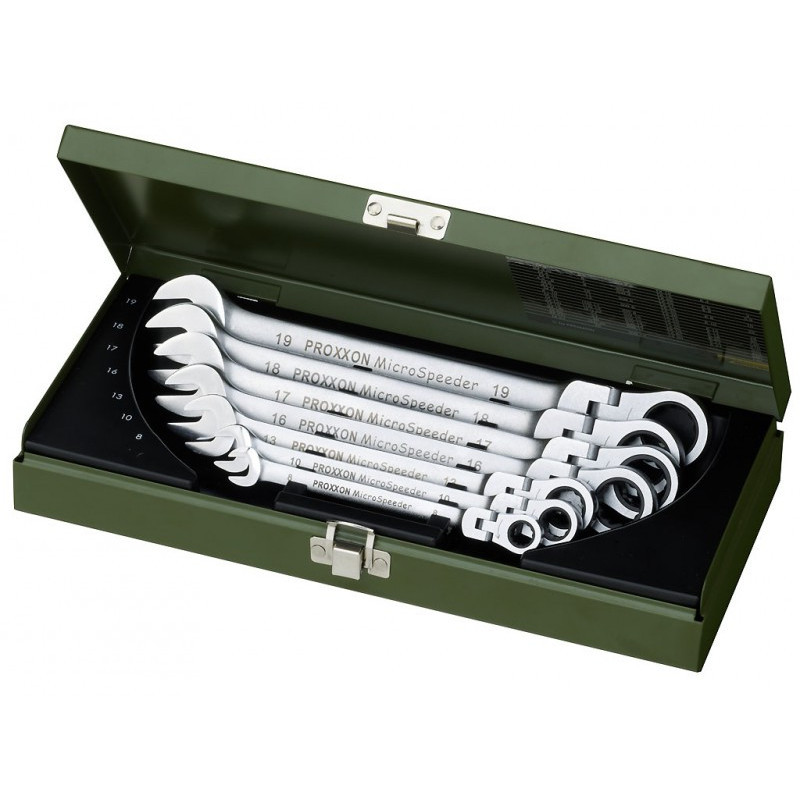 7-dielna, vnútorný krúžok z vysoko legovanej ocele so 72 zubmi, doťahovanie už pri pohybe o 5°, telo z chróm-vanádiovej ocele, kĺb výkyvný do 90°, extra dlhé prevedenie, balená v kovovom lakovanom kufríku
