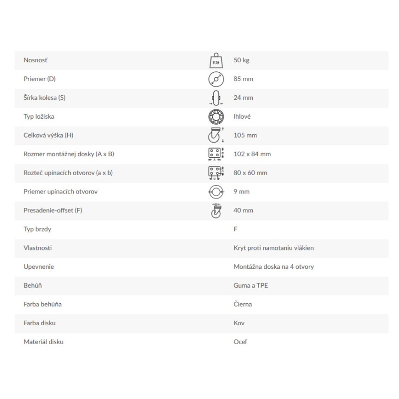 Otočné rolovacie koliesko s montážnou doskou na štyri otvory