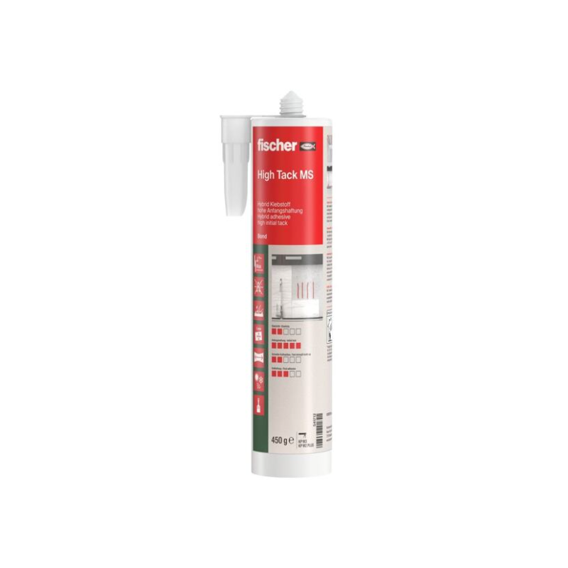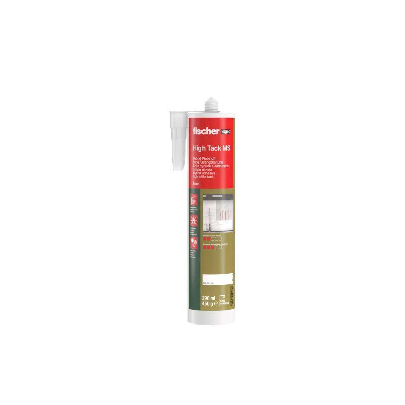 fischer HighTack MS je jednozložkový hybridný lepiaci tmel na báze MS-polyméru. Vďaka zloženiu a viskozite má tmel veľmi vysokú počiatočnú priľnavosť, takže nie je potrebné lepené predmety fixovať a chrániť ich pred nežiaducim posunom. Lepidlo je vhodné na lepené spoje vystavené namáhaniu v ťahu, tlaku alebo šmyku v rámci tolerancií. HighTack MS je vhodný na lepenie tepelnoizolačných a akustických dosiek, paluboviek, drevených panelov, nenasiakavých materiálov, schodiskových stupňov, prahov alebo parapetov. Špeciálny aplikačný hrot v tvare písmena V uľahčuje vytláčanie. Po nanesení začne lepidlo reagovať so vzdušnou vlhkosťou a vytvrdzovať. Vytvrdnuté lepidlo je odolné voči vode a poveternostným vplyvom a má veľmi vysokú pevnosť. Čerstvé lepidlo je bez zápachu a dymu, vďaka čomu je vhodné na prácu v ťažko vetrateľných priestoroch.