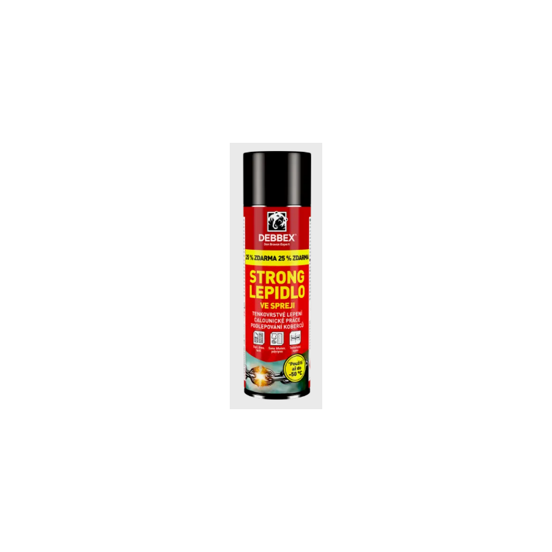 STRONG Lepidlo v spreji je vysoko kvalitné a všestranné lepidlo. Je možné aplikovať aj pri nižších teplotách do -50 °C. Vyvinuté na tenkovrstvové lepenie, čalúnnické práce, podlepovanie kobercov s vysokou počiatočnou adhéziou a priľnavosťou.