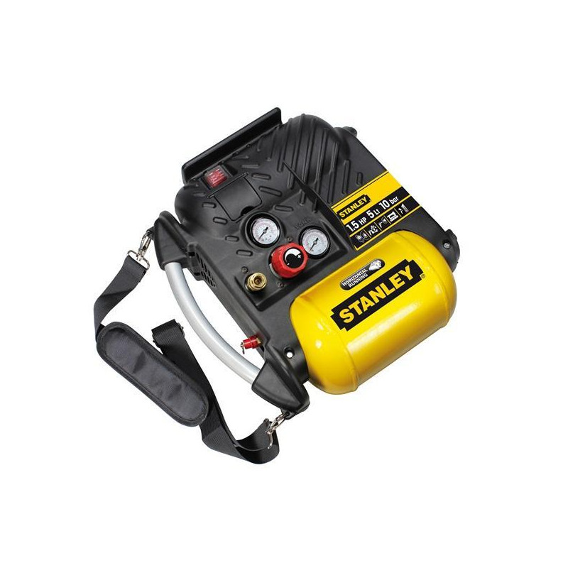 Samomazný, prenosný, kompaktný kompresor s integrovaným riadiacim panelom, masívnou rukoväťou a popruhom pre ľahkú manipuláciu.