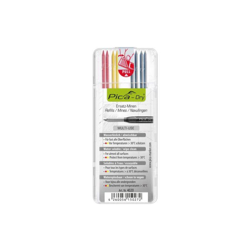 Pica, vodou riediteľné „viacúčelové“ tuhy, prakticky pre všetky povrchy - suché aj mokré, hladké aj drsné, prašné aj mastné, svetlé aj tmavé, z hladkých povrchov sa dajú zotrieť vlhkou handričkou, v praktickom a robustnom boxe zo syntetického materiálu, D= 2,8 mm x 125 mm, zastrúhané