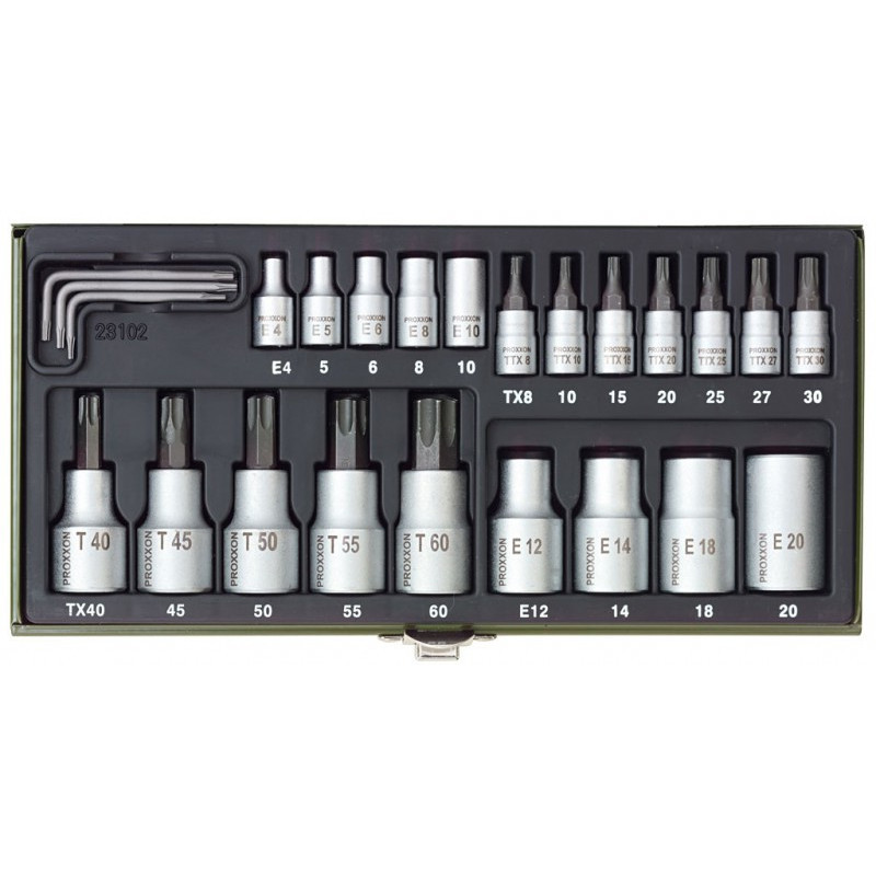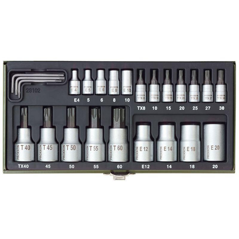 Profesionálna sada TORX hlavíc PROXXON 23102 obsahuje 24 dielov, ktoré pokrývajú široký rozsah veľkostí pre presnú a spoľahlivú prácu so skrutkami typu TORX. Kompletný rozsah TORX veľkostí od T6 po T50, vhodný pre rôzne aplikácie v automobilovom, elektrotechnickom i bežnom remeselnom sektore.