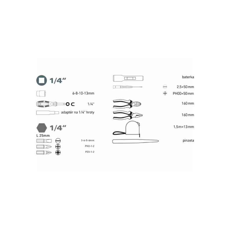PROXXON Gola sada 1/2" 23000 je kvalitná 29-dielna súprava určená pre náročné mechanické práce. Obsahuje široký rozsah nástrčných hlavíc, predĺžené hlavice, hlavice na sviečky, račňu, predĺženie a kardan, všetko uložené v pevných oceľových kufríkoch s polypropylénovou vložkou. Všetky diely sú vyrobené z chróm-vanadiovej ocele, čo zaručuje vysokú odolnosť a dlhú životnosť.