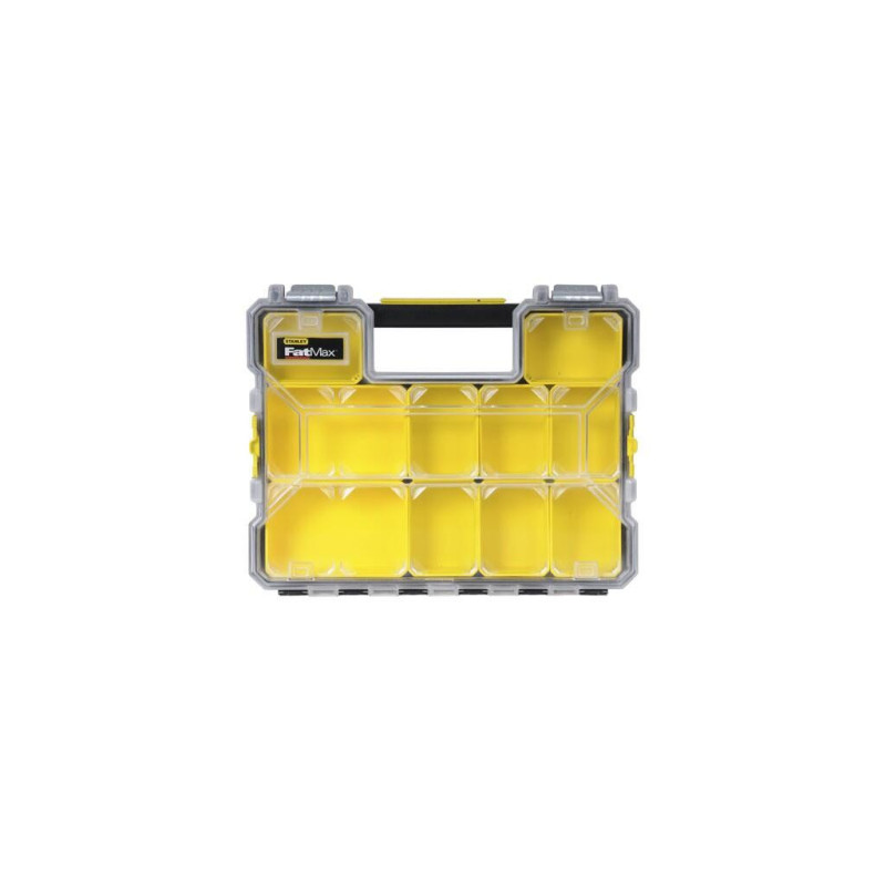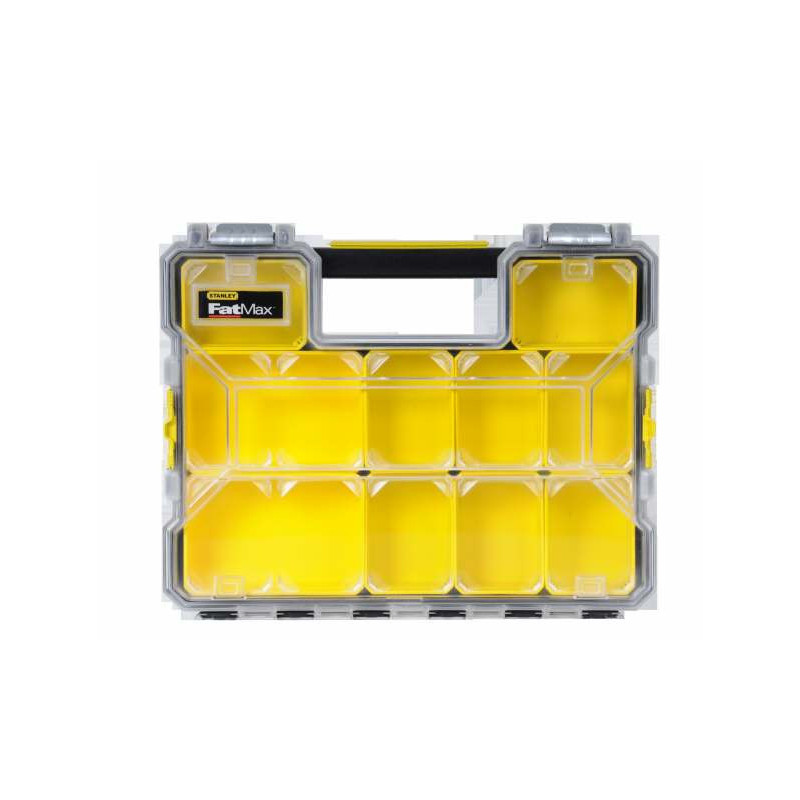Priehľadný nerozbitný vrchnák uzamyká priehradky a chráni ich obsah pred vysypaním. Rozmerná rukoväť uľahčuje prenášanie i veľmi ťažkého obsahu. Vyberateľné priehradky i rozdeľovače. 97-517 – s kovovými západkami, vodotesné (IP53)