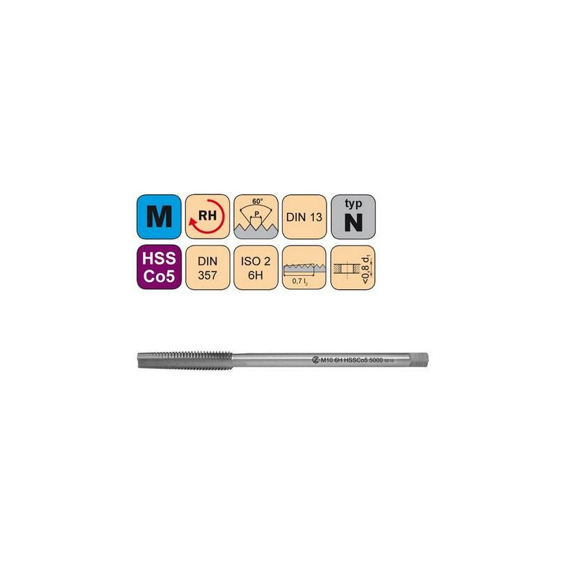 Maticový závitník pro metrický závit,vhodný pro konstrukční oceli, nelegované oceli, automatové oceli, zušlechtěné oceli, slitiny hliníku, slitiny mědi s krátkou drobivou třískou.